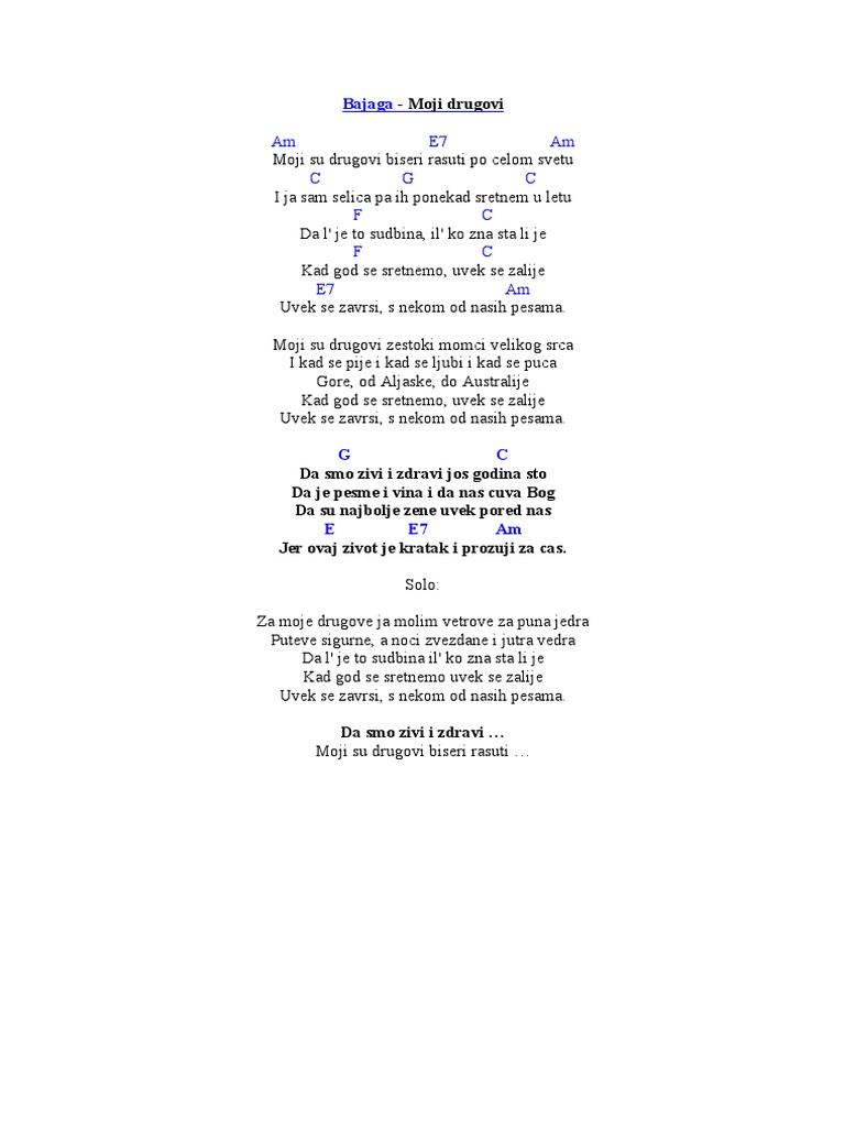 Moji su drugovi. Am e7 am c g c f c f c e7 am e7 moji su drugovi biseri rasuti am po celom svetu c g i ja sam selica pa ih ponekad c sretnem u letu f c dal je to sudbina il ko zna šta li je f c kad god se sretnemo uvek se zalije e7 am uvek se završi s nekom od naših pesama moji su drugovi žestoki momci velikog srca i kad se pije i kad se ljubi i kad se puca gore od aljaske do australije kad god se. English 1 2 greek italian norwegian polish russian. Da l je to sudbina il ko zna sta li je kad god se sretnemo uvek se zalije uvek se zavrsi s nekom od nasih pesama. Moji su drugovi biseri rasuti po celom svetu i ja sam selica pa ih ponekad sretnem u letu.