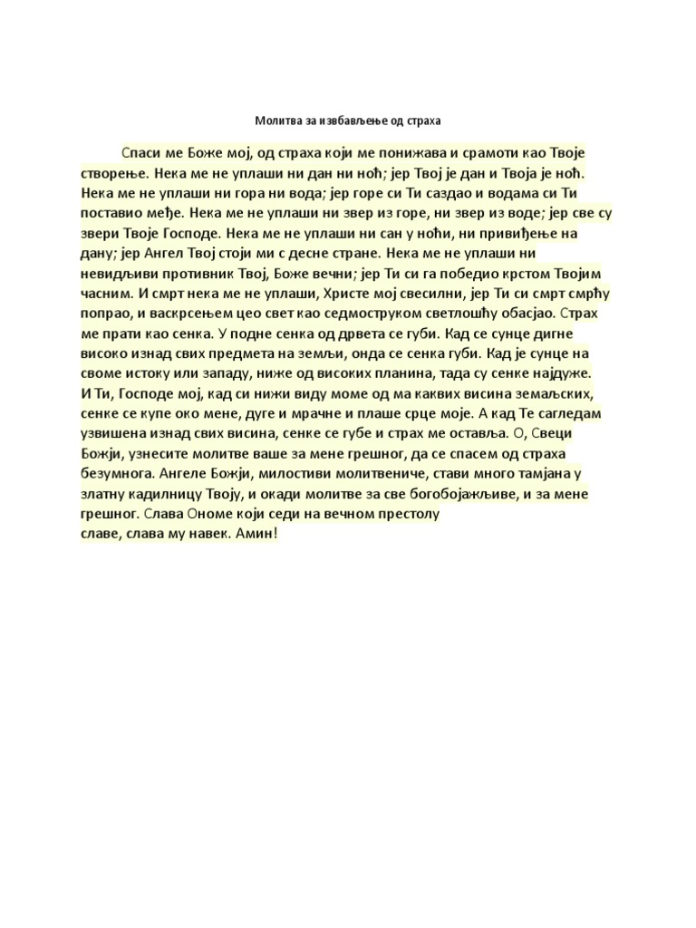 Molitva protiv straha. Jer sve su zveri tvoje gospode. Neka me ne uplaši ni zver iz gore ni zver iz vode. Molitva za spasenje od straha spasi me bože moj od straha koji me ponižava i sramoti kao tvoje stvorenje. Kada smo tjeskobni zbog nečega pozvani.