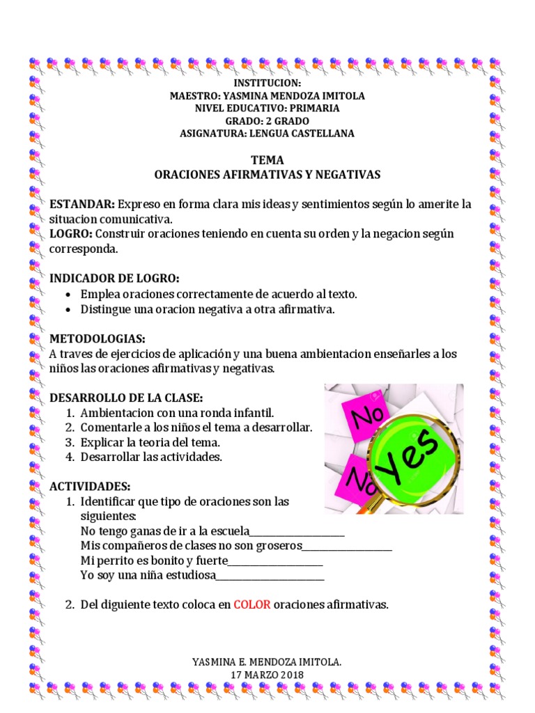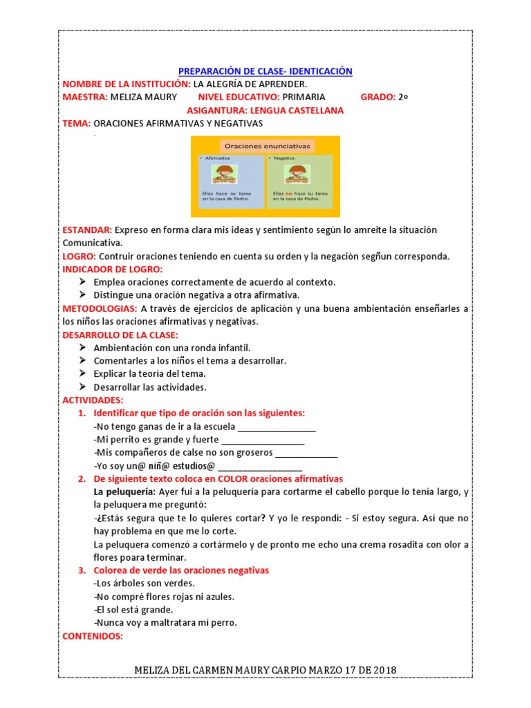 Oraciones Afirmativas Y Negativas Para Segundo Grado De Primaria
