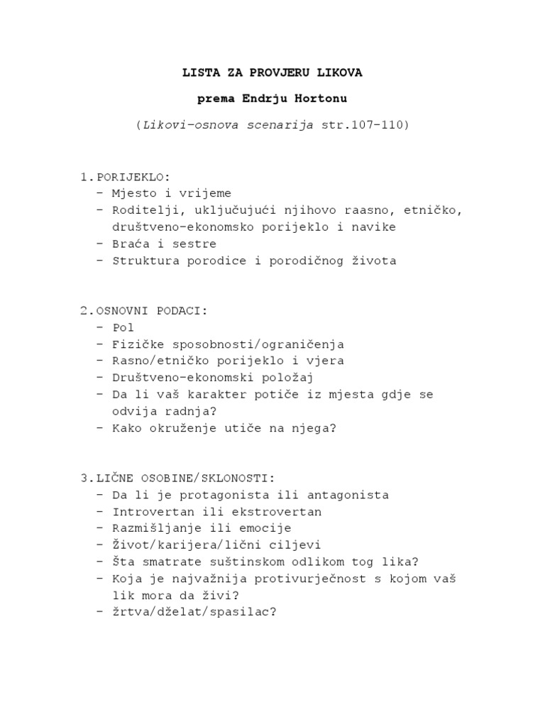 Lista Za Provjeru Likova Prema Endrju Hortonu