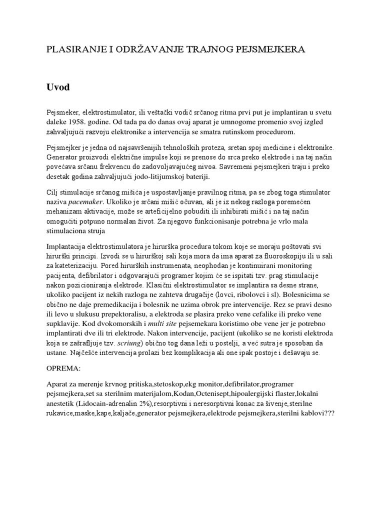 Plasiranje I Odrzavanje Trajnog Pejsmejkera